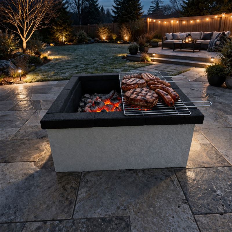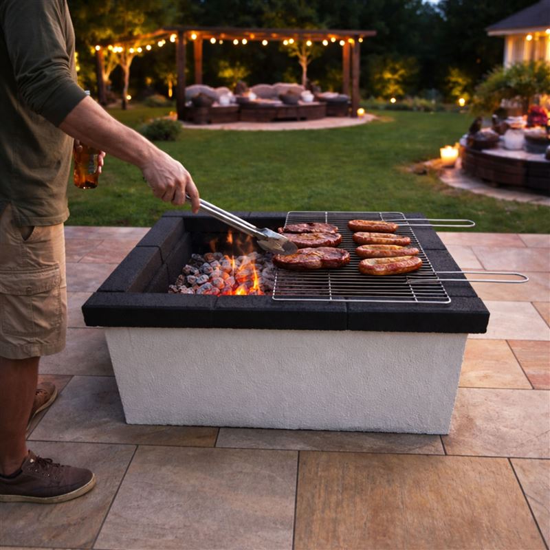 Create a striking and functional feature in your garden with this square masonry garden fire pit with cooking grill. Designed as a permanent outdoor fire pit, it combines the warmth and ambience of a real wood fire with the added benefit of open-flame cooking, making it ideal for outdoor entertaining and relaxed evenings outside.